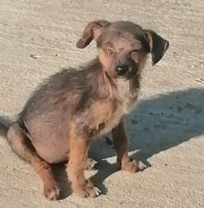 Auf den ersten Blick konnten wir sofort Räude feststellen. Das Fell ist fast komplett ausgefallen. Außerdem sind die Augen stark entzündet.